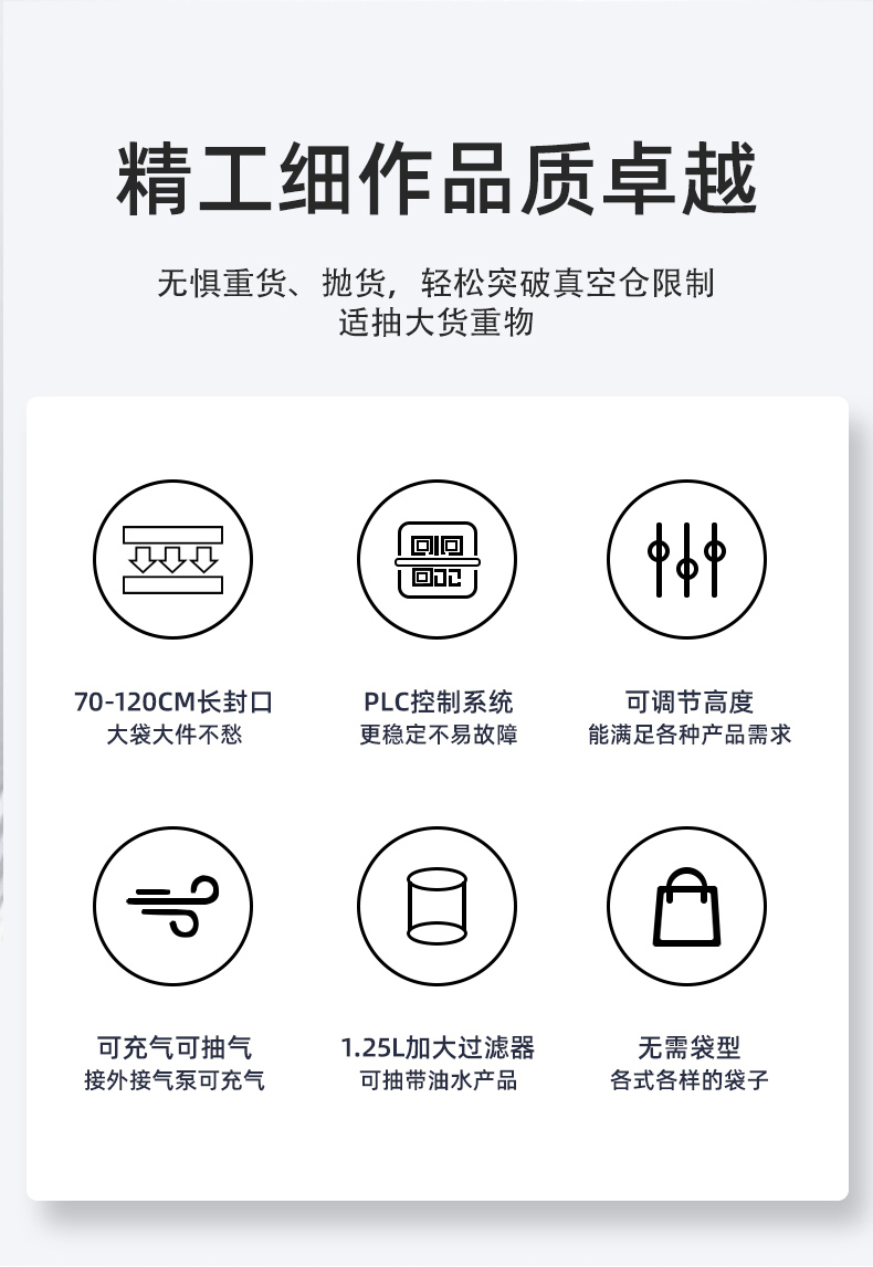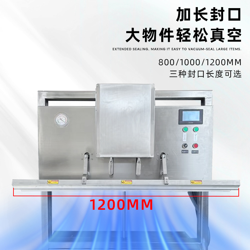 可定制與多模式適配不同尺寸:部分機型支持封口規格定制,封口長度可達到 800mm、1000mm 甚至 1200mm 等,適配不同寬度的包裝袋。同時,部分先進機型預設多組工作模式,可快速切換真空、充氣、封口等流程,適配從小袋糕點到大袋五金模具等不同尺寸、類型產品的包裝需求。