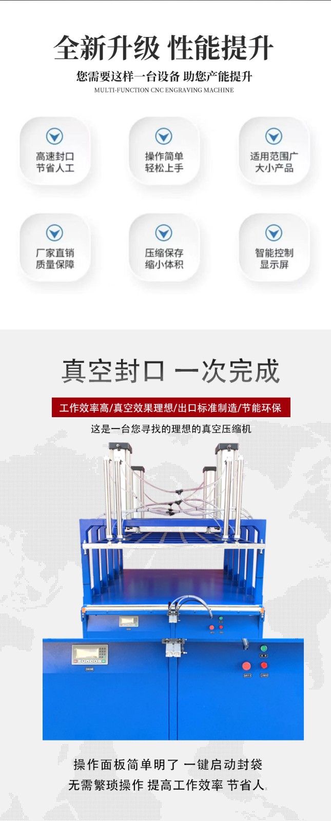 - 產品尺寸和形狀:如果產品尺寸較大或形狀不規則,需要選擇真空室尺寸足夠大、能夠適應產品形狀的真空壓縮封口機。例如,對于大型家紡產品的包裝,要選擇真空室寬敞、開口較大的設備,方便產品的放入和取出;對于有突出部分或特殊形狀的產品,如帶有長柄的工具,要考慮設備是否能夠在真空抽取和壓縮過程中有效處理這種形狀,避免產品損壞或包裝不完整。